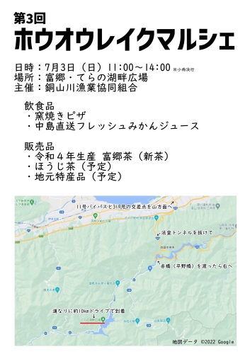 プレスリリース 2022.06.29 7月3日(日)11時よりてらの湖畔広場にて第3回ホウオウレイクマルシェを開催します。 内容は前回と同じ予定ですが、富郷茶の新茶やほうじ茶などをある程度ご用意しました。 今のところ他では買えない商品ですので、ぜひお越しください。 お待ちしております。