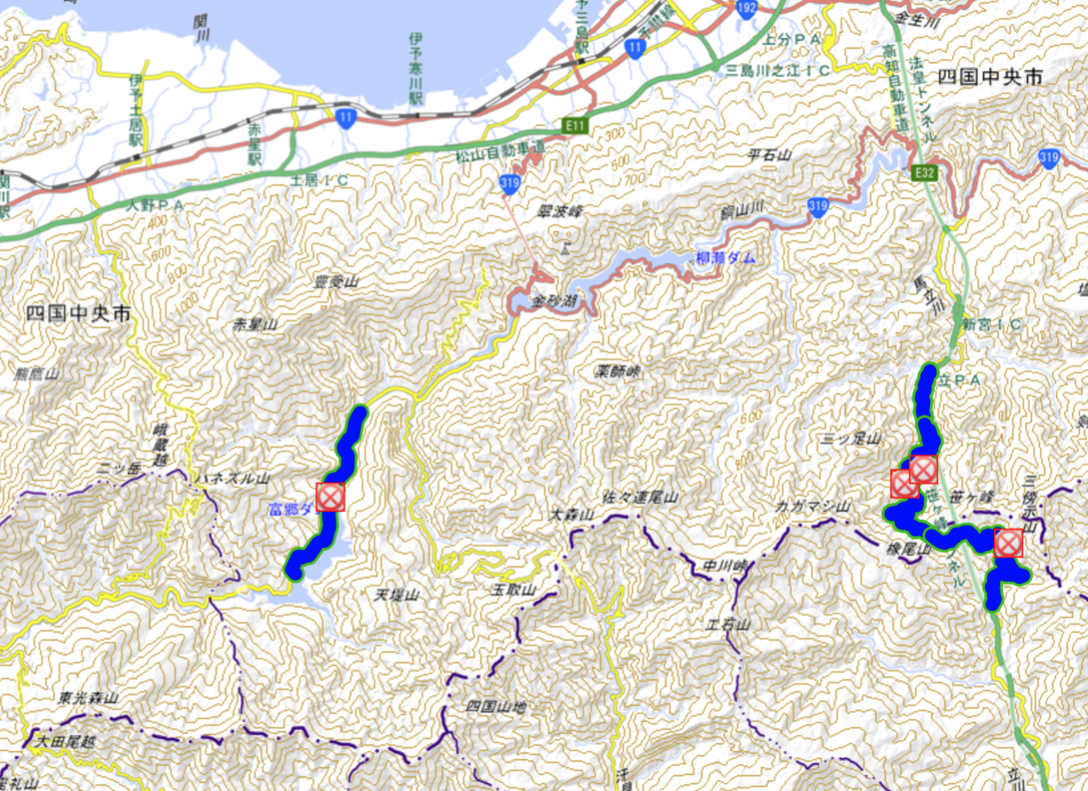 ●金砂・富郷方面からは、藤原大橋から先が通行止め(https://goo.gl/maps/L36eeRAWTopHiotF6)